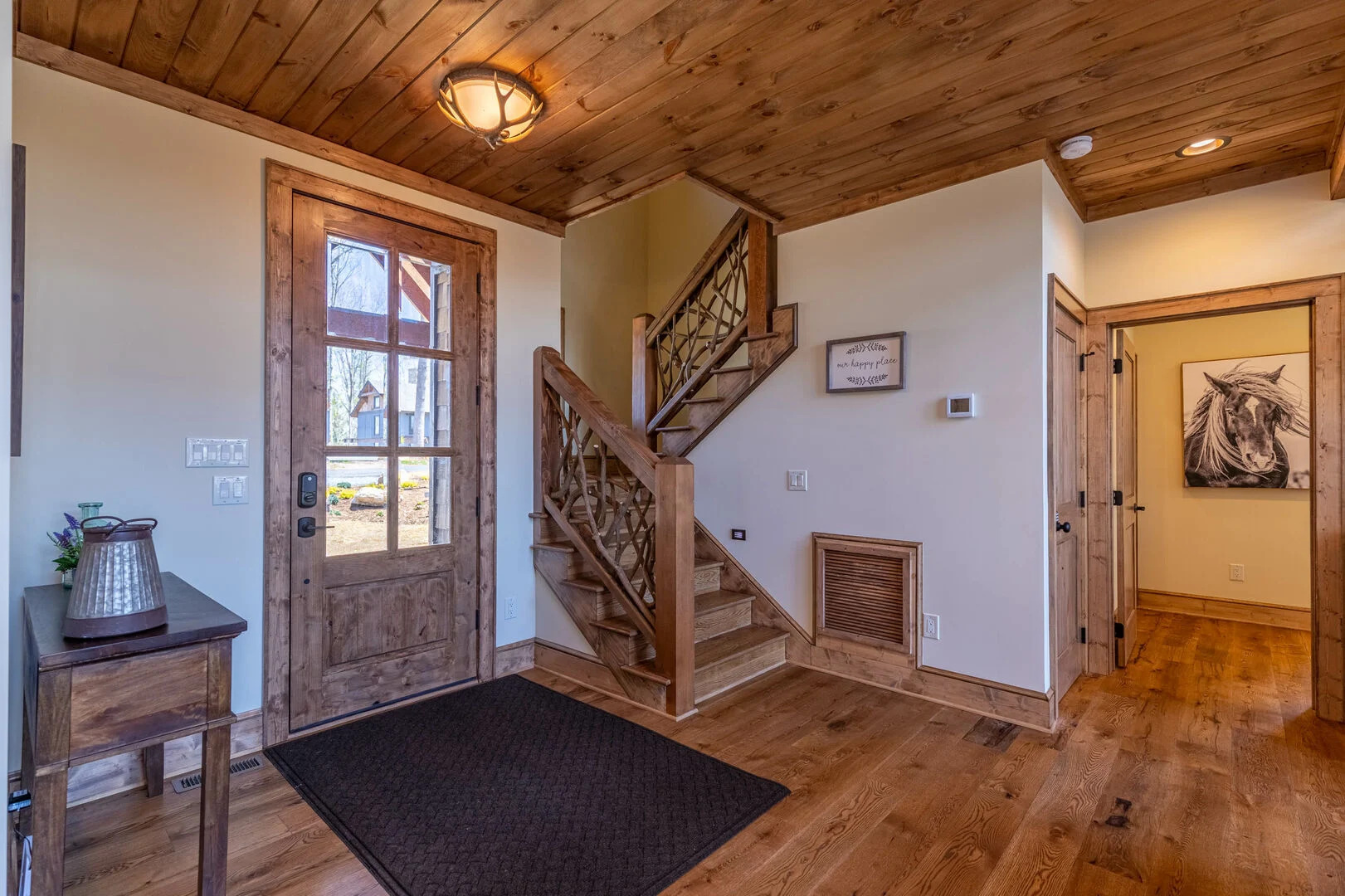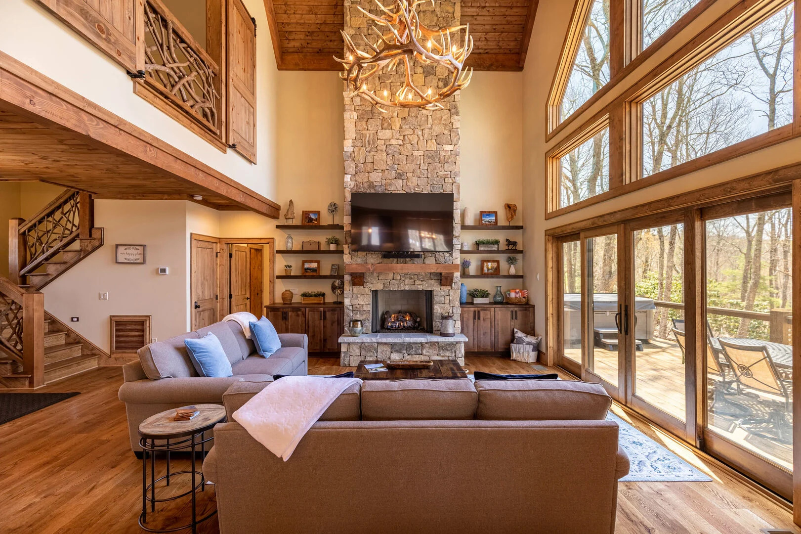 With only a step to enter the main door from the flat, circular drive, you will enter the open concept great room. Spacious, vaulted, tongue and groove ceilings are met by the rising gas fireplace with two full size sofas situated around the fireplace and mounted 75-inch smart TV.
