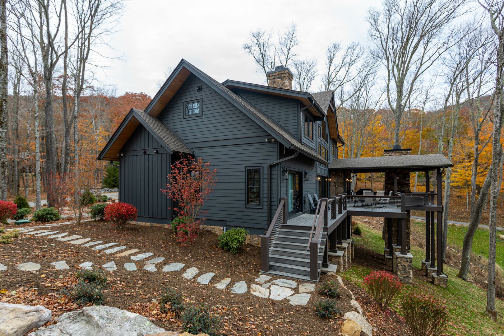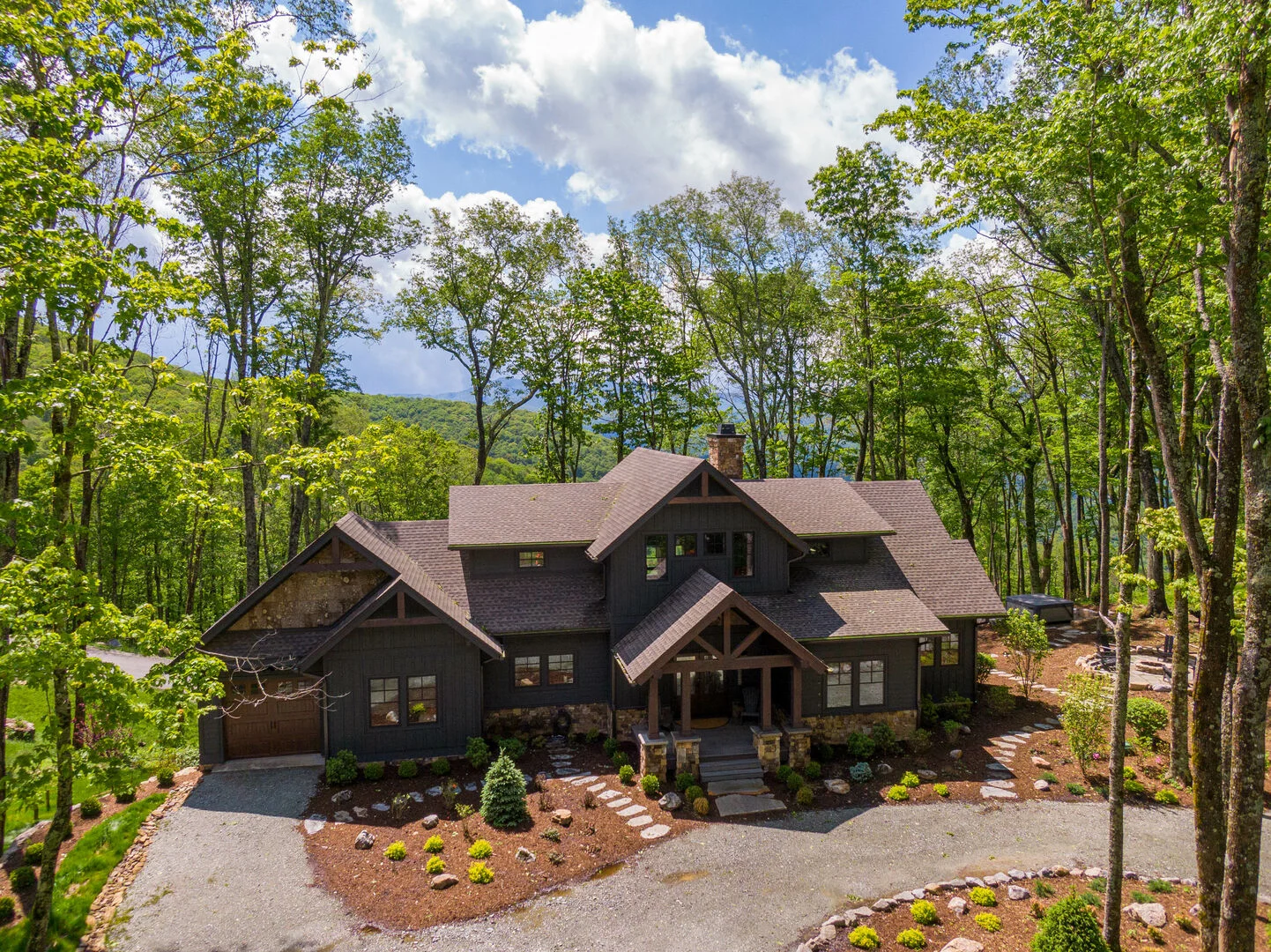 Enter the main level and enjoy the view of the profile of Grandfather Mountain through the wall of windows. The open concept great room features cathedral ceilings, a stacked stone gas fireplace and a 75 inch smart TV with surround sound. To the left is the dining area and spacious kitchen. Granite countertops and black steel appliances surround the beautiful island which seats four. The dining room features a 72 inch table which expands to 90 inches, a chandelier and access to the covered deck area. Towards the garage entrance is the laundry center and half bath. Across the hall is the game room equipped with a sofa, 65 inch smart TV, two person arcade, foosball and game table, making it a perfect place to have fun and relax. On the opposite side of the homeyou’ll find the main level King Suite. It has a 65 inch smart TV, deck access, and a fabulous attached bath with tiled shower, separate soaking tub, and double granite vanity. A second bedroom is across the hall with a Queen bed and a 55 inch smart TV. The hallway also has second full bath with a tiled shower and granite vanity.
