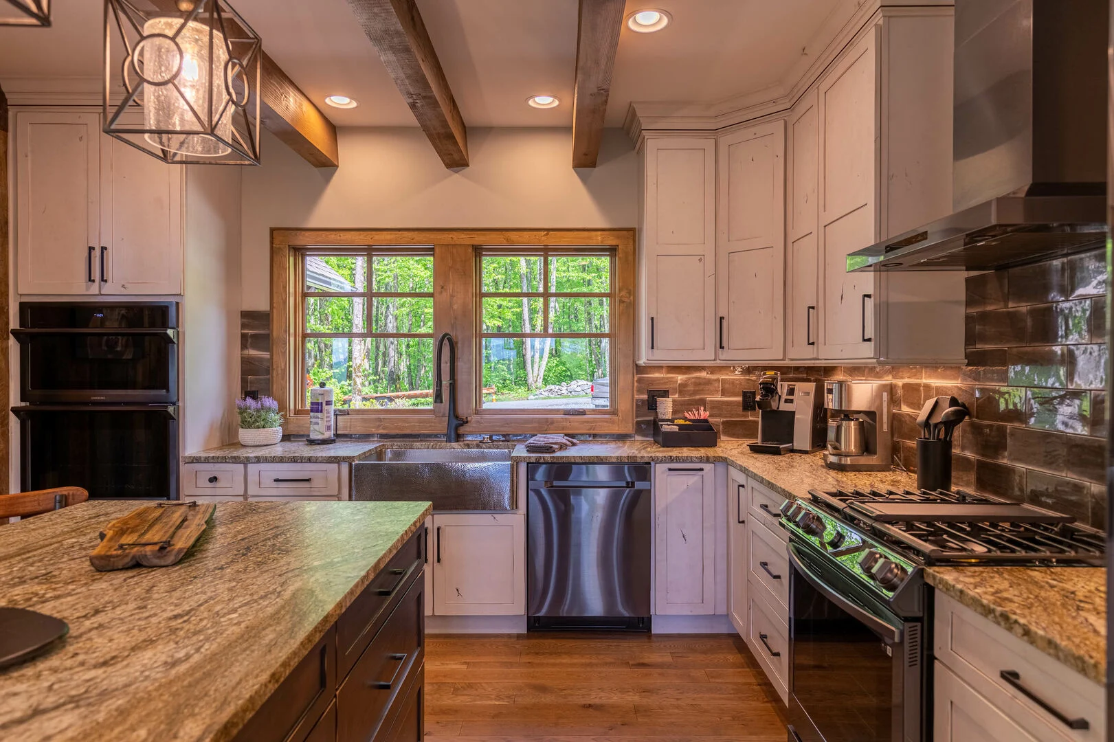 The deck might be where you spend the most time as you look over the beautiful mountains. The covered deck features an outdoor woodburning fireplace, BBQ and seating. The deck runs the length of the house with steps that lead you to the new hot tub and fire pit. The level parking area has room for four cars comfortably. The garage is accessible for skies, bikes and other property.