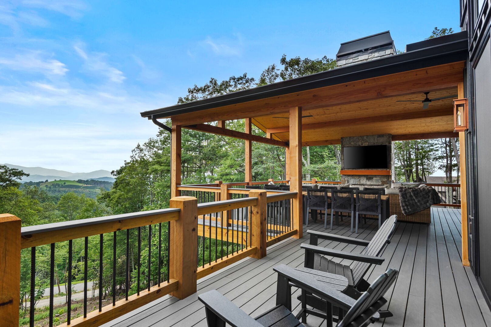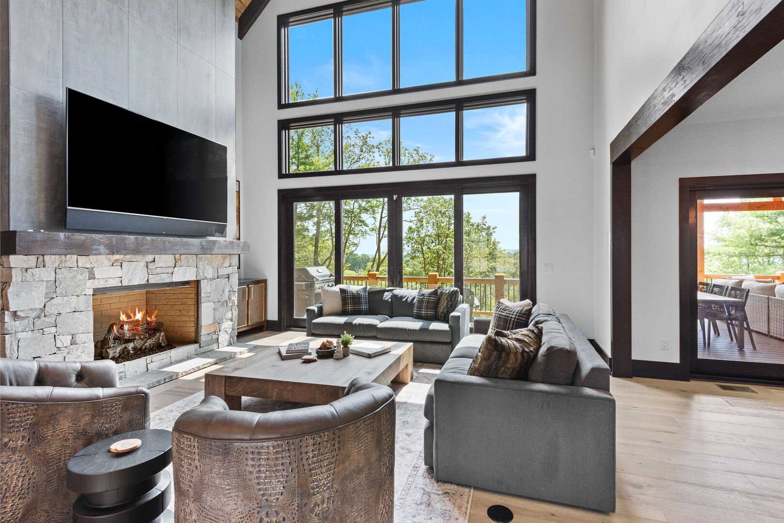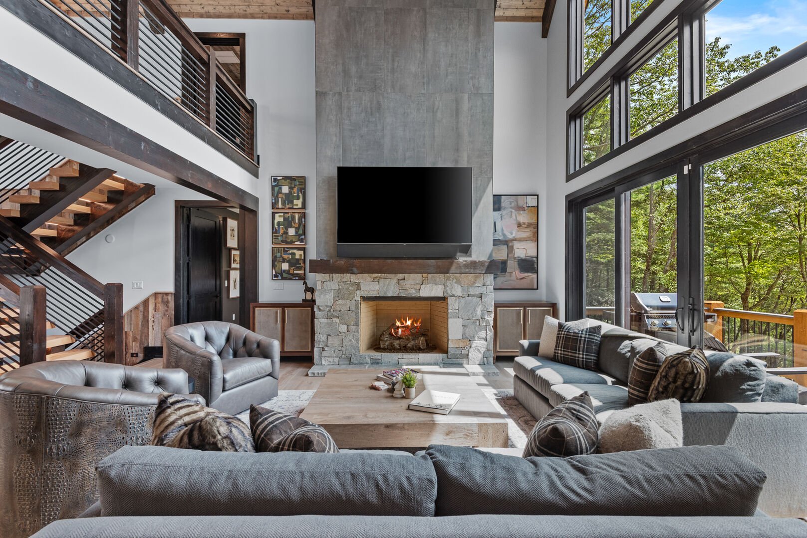 Outdoor living at One More Day is nothing short of exceptional, with two oversized decks designed for every season. The main-level deck includes a gas fireplace, TV, dining table for 12, and a gas grill, perfect for entertaining while soaking in the views. The lower deck features another fireplace, a TV, and a hot tub, creating a serene retreat under the stars. From there, steps lead down to a stone firepit surrounded by Adirondack chairs, where evenings are best spent sharing stories and s’mores.