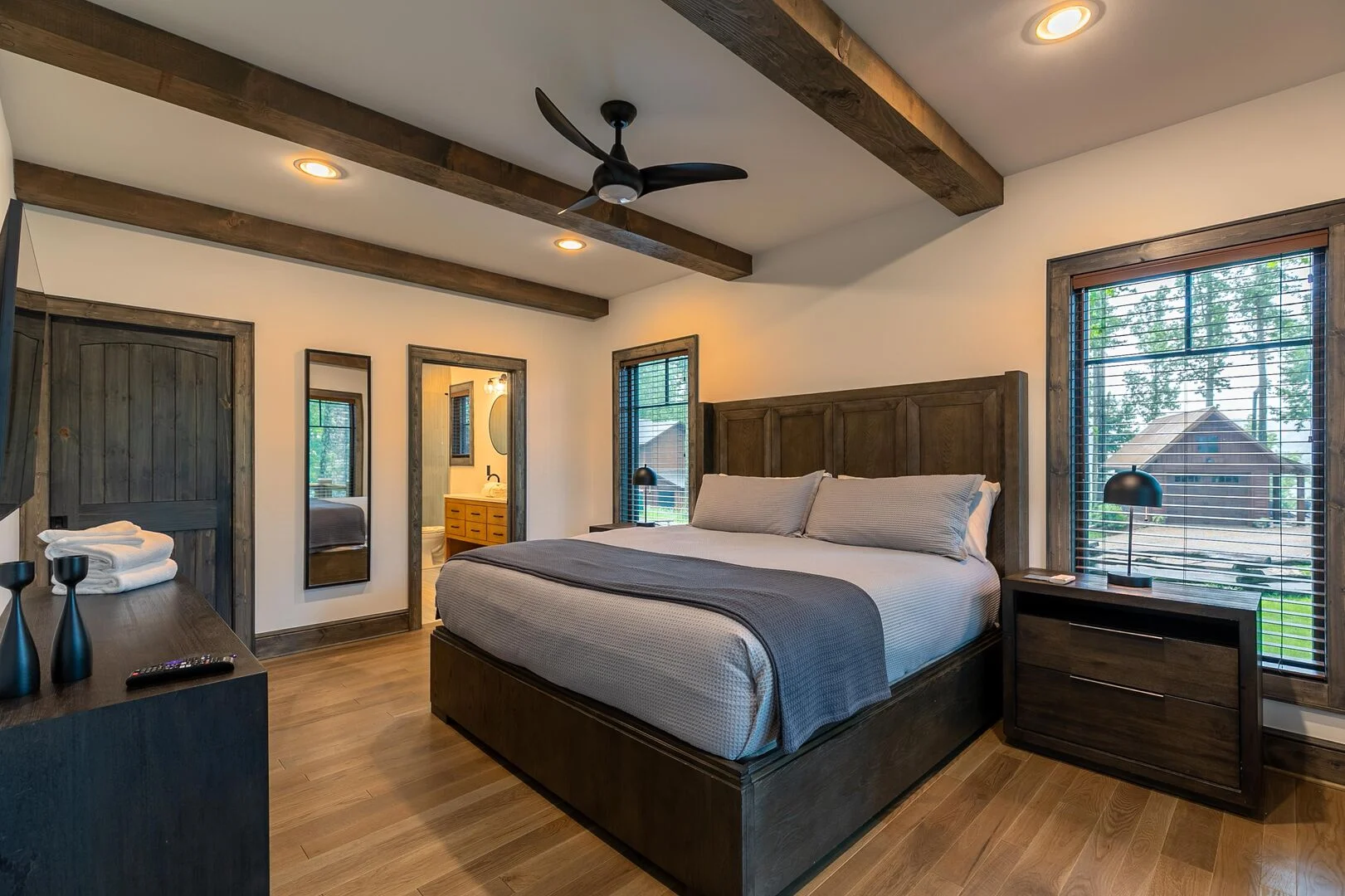 Upstairs are two bedrooms with a shared full bath in the hallway, featuring a premium tiled shower and ample space for guests to prepare for the day. To the right is a large, second king bedroom with stunning views of the mountain, and to the left, two sets of twin-over-twin bunk beds and plenty of room to relax or enjoy some of the games available for guests. All 3 bedrooms have smart TV’s mounted on the wall.