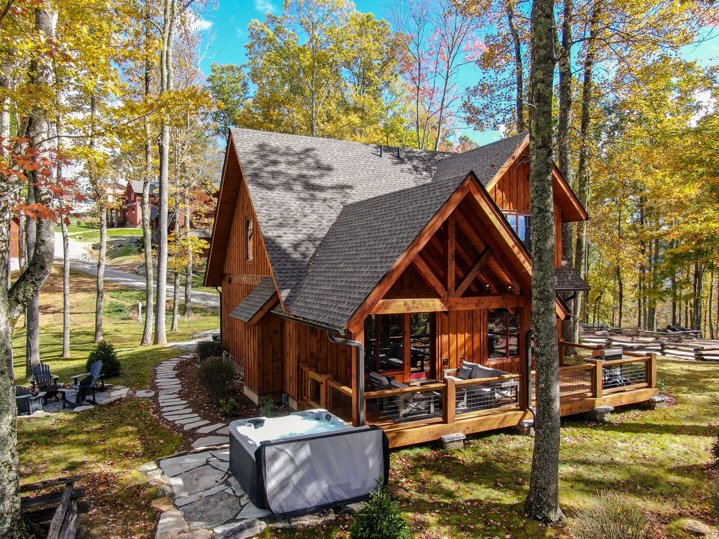 Step outside and let the cool mountain breeze refresh you on the spacious deck, which is partially covered to provide both shade and sun. Here you will find a gas grill ready for making delicious mountain meals, and a comfortable seating area just waiting to be relaxed on. Just a step down from the deck you’ll find a rustic firepit, ready for a fun evening of roasting marshmallows and telling stories, and an inviting hot tub perfect for relaxing after your day. The property has plenty more space beyond for fun outdoor games and a large area for families to enjoy outdoor living. There is also room for parking 3 cars at this home.